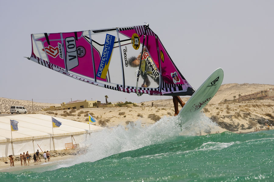 For an hour before lunch, the thermal heat wave gave way to a short period of 25 knot trades, which saw the entire fleet take to the water to try an train for the super session. The scene was incredible – 40 of the world’s best windsurfers gave it their all to impress the enormous crowd that filled the white sand of Sotavento.